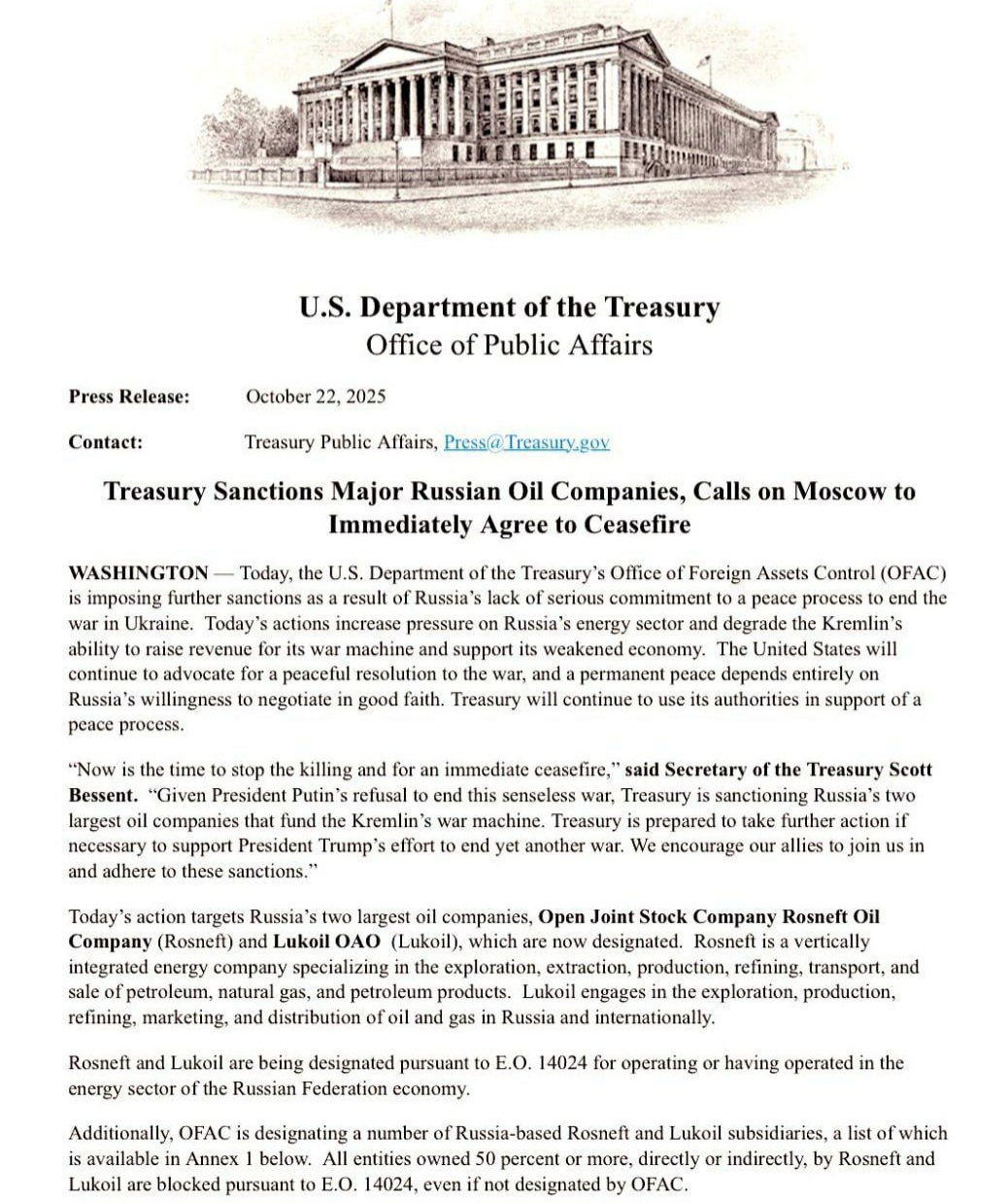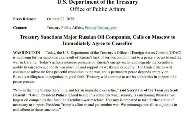 وزارت مالیه ایالات متحده روز چهارشنبه (۲۲ اکتوبر ۲۰۲۵) تحریمهای جدیدی را علیه دو شرکت بزرگ نفتی روسیه، روسنفت و لوکاویل، اعمال کرد.