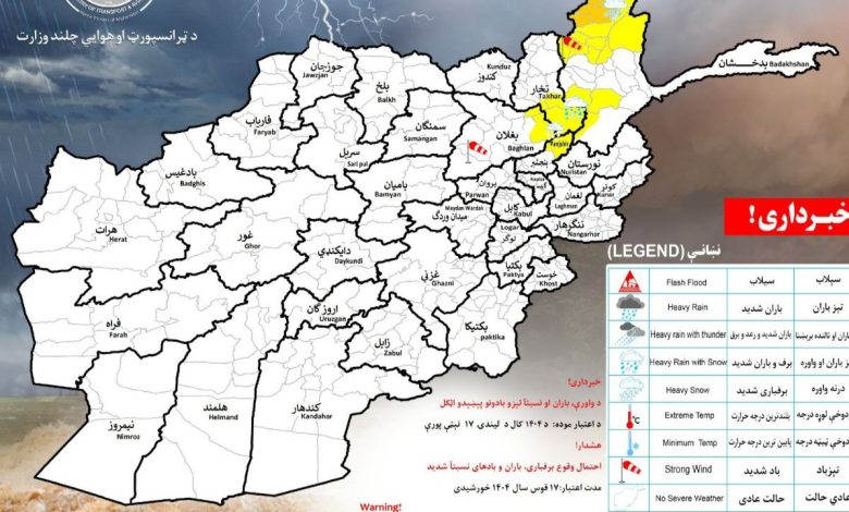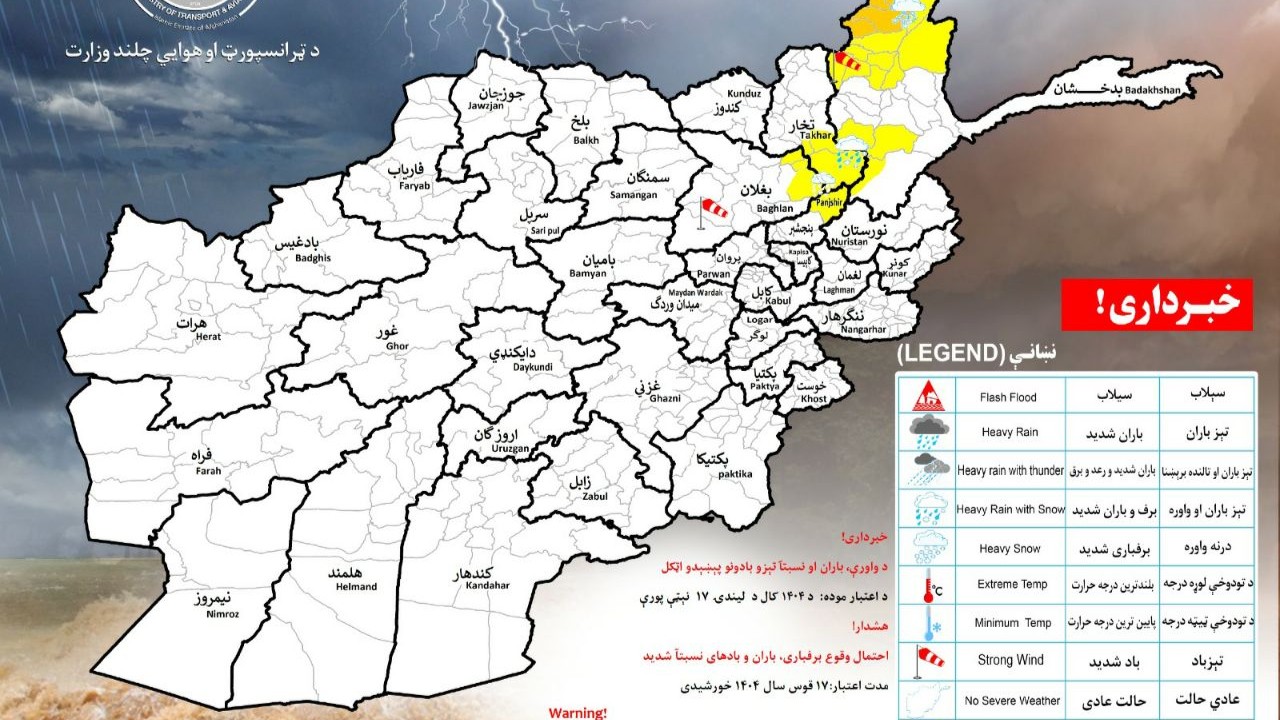 ریاست هواشناسی وزارت ترانسپورت و هوانوردی اعلام کرد که روز دوشنبه (۱۷ قوس ۱۴۰۴) در ولایتهای بدخشان، تخار، بغلان و پنجشیر بارش برف، باران و بادهای نسبتاً شدید پیشبینی میشود.