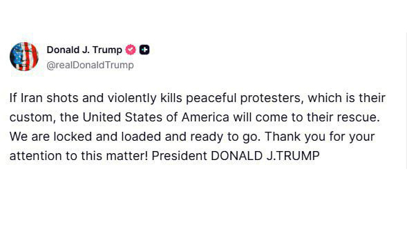 ترامپ نوشت: «اگر ایران به معترضان مسالمتآمیز شلیک کند و آنها را به طرز خشونتآمیزی بکشد، که این رسم آنهاست، ایالات متحده آمریکا به نجات آنها خواهد آمد؛ ما آمادهایم.»
