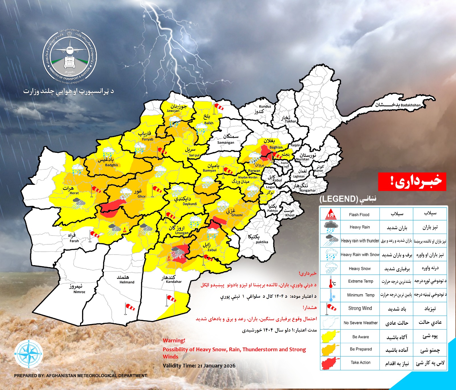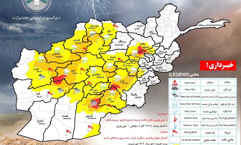 ریاست هواشناسی وزارت ترانسپورت و هوانوردی ملکی امارت اسلامی افغانستان نسبت به شرایط جوی بسیار نامساعد در روز چهارشنبه (۱ دلو ۱۴۰۴ خورشیدی) هشدار داد.