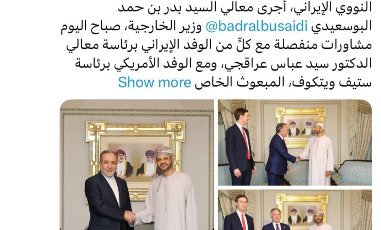 بدر بن حمد البوسعیدی، وزیر امور خارجه سلطنت عمان، صبح امروز (جمعه، ۱۷ دلو) بهطور جداگانه با هیئت ایرانی به ریاست سید عباس عراقچی و هیئت آمریکایی به ریاست استیو ویتکاف (نماینده ویژه رییسجمهور آمریکا) و جرد کوشنر رایزنی کرد.
