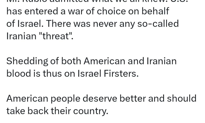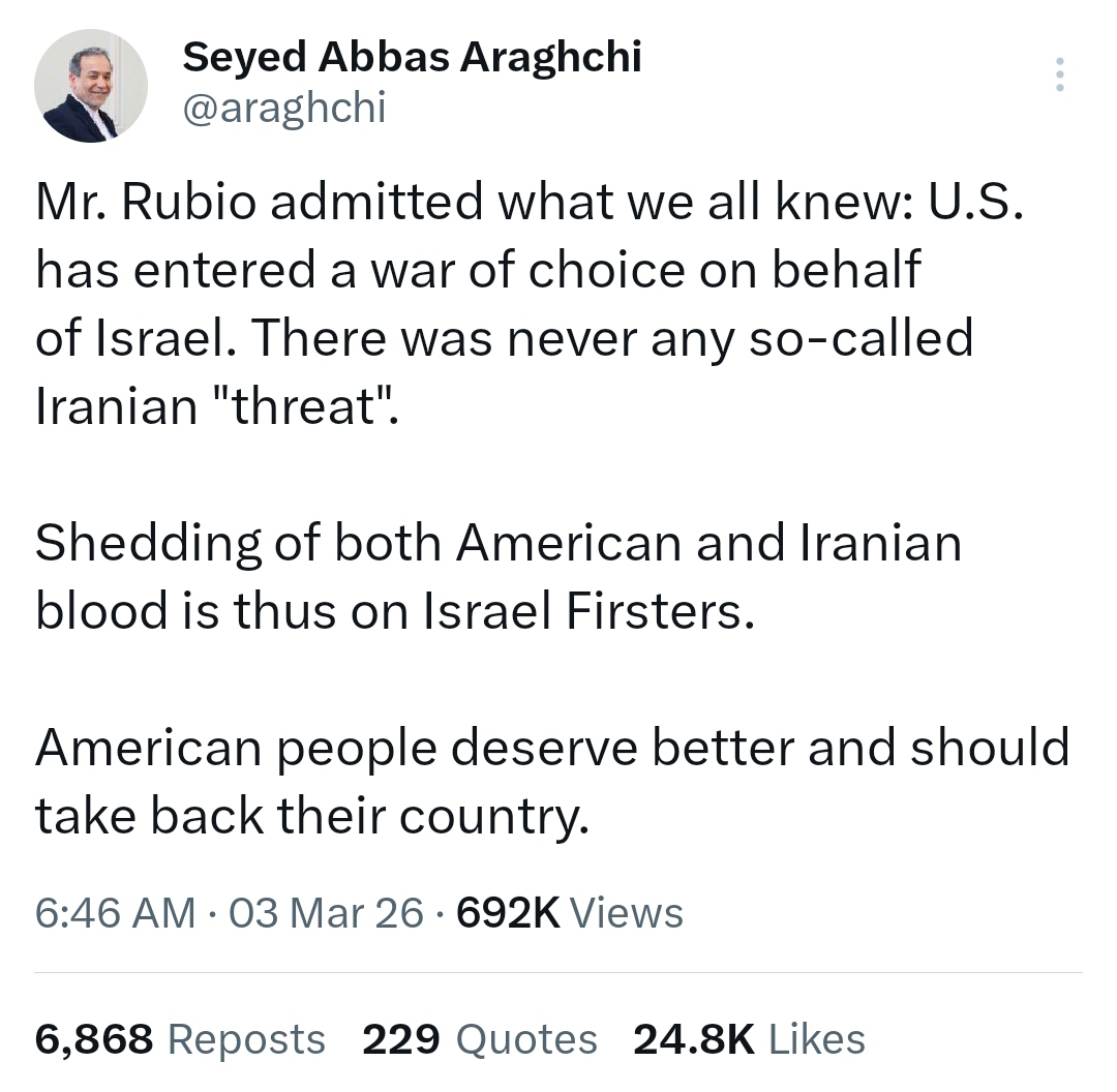 سید عباس عراقچی، وزیر امور خارجه جمهوری اسلامی ایران، در پیامی در شبکه ایکس در واکنش به اظهارات مارکو روبیو، وزیر خارجه آمریکا، نوشت: آقای روبیو به چیزی اعتراف کرد که همه ما میدانستیم؛ ایالات متحده به انتخاب خود وارد جنگ به نفع اسرائیل شده است و هرگز هیچ تهدیدی از سوی ایران علیه آمریکا وجود نداشته است.