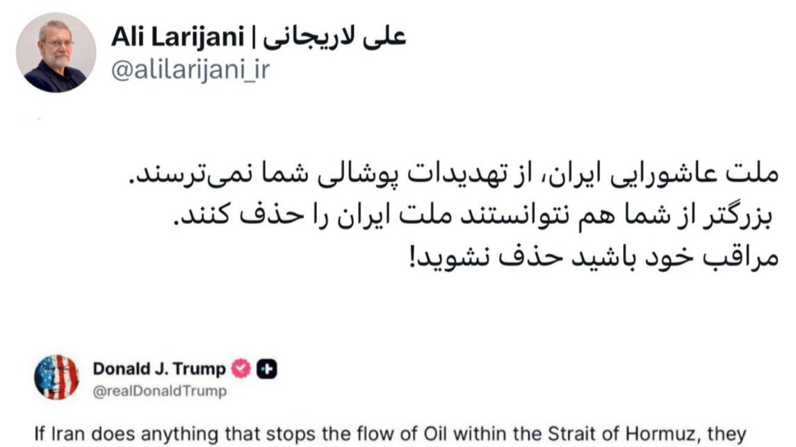 علی لاریجانی، دبیر شورای عالی امنیت ملی ایران، در اظهاراتی قاطع و هشدارآمیز گفت: «ملت عاشورایی ایران از تهدیدات پوشالی شما نمیترسد؛ بزرگتر از شما هم نتوانستند ملت ایران را حذف کنند.»
