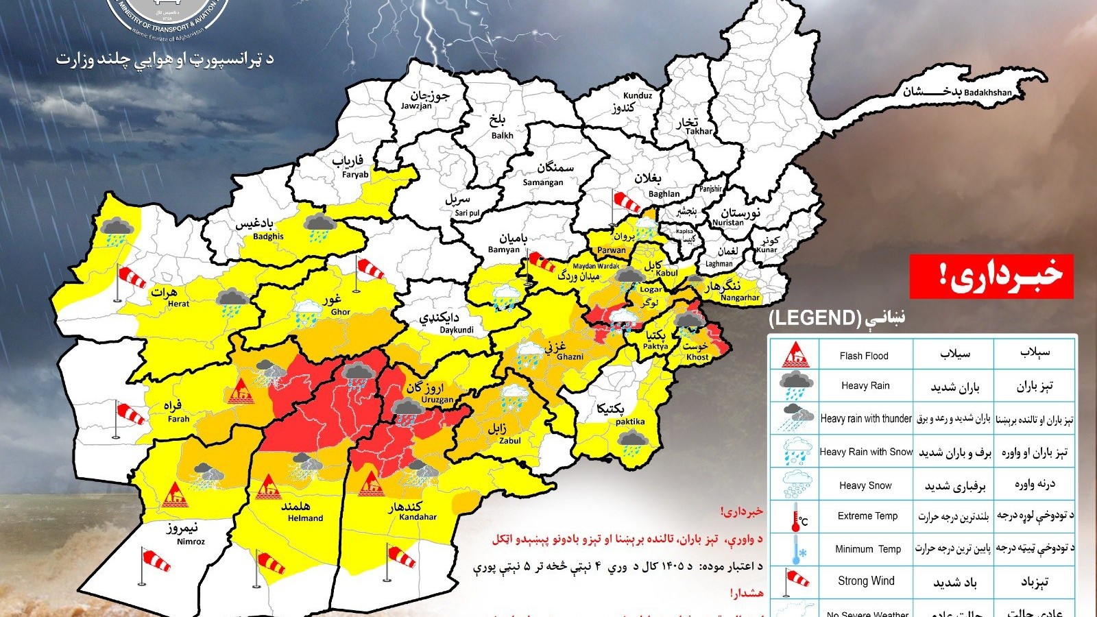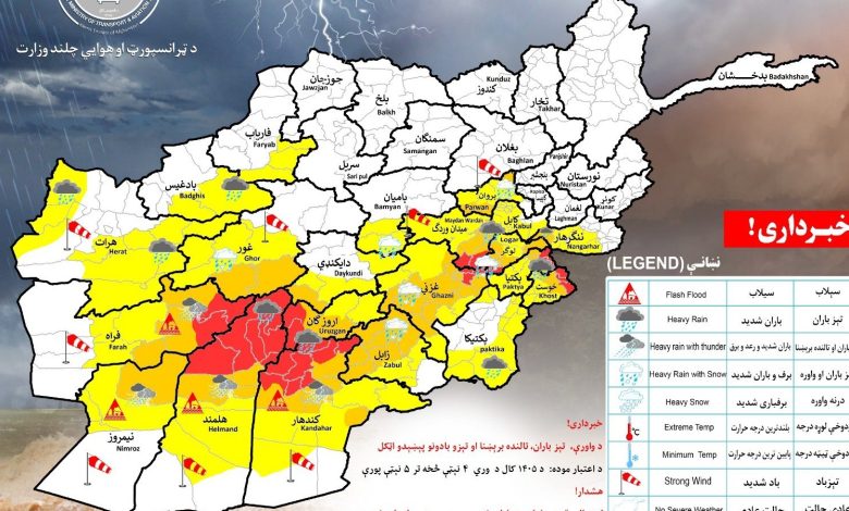 وزارت ترانسپورت و هوانوردی ملکی امارت اسلامی افغانستان اعلام کرد که فردا و پسفردا احتمال بارش برف و باران نسبتاً سنگین همراه با رعد و برق در ۲۱ ولایت کشور وجود دارد.