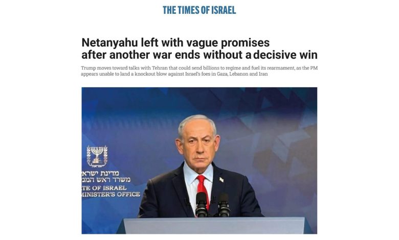روزنامه تایمز اسرائیل نوشت که بنیامین نتانیاهو پس از پایان جنگ، بدون دستیابی به پیروزی قاطع و تنها با وعده‌های مبهم، تنها مانده است.