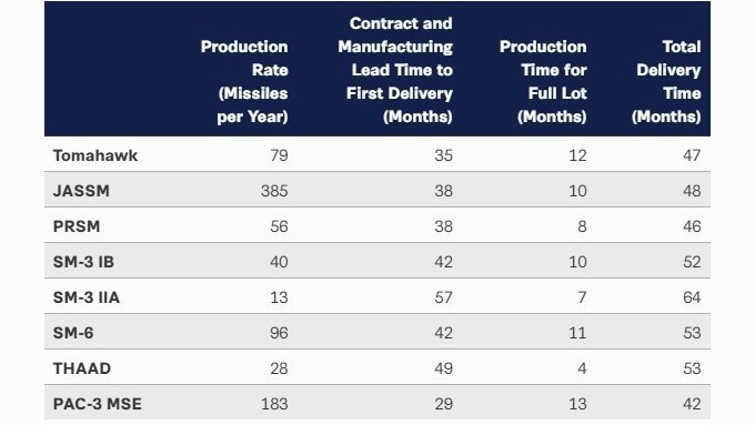 اطلاعات نشان میدهد که زمان تحویل کامل بسیاری از این مهمات بین ۴۲ تا ۶۴ ماه طول میکشد؛ بهعنوان مثال، موشکهای SM-3 IIA تا ۶۴ ماه زمان برای تولید و تحویل نیاز دارند که نشاندهنده کندی چرخه تأمین است.
