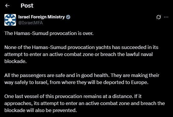 ووفقًا لوزارة الخارجية الإسرائيلية، لم يتبقَّ سوى “سفينة أخيرة” على بُعد، وإذا اقتربت، فسيتم منع محاولتها دخول منطقة الحرب النشطة وكسر حصار غزة.