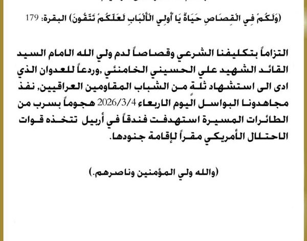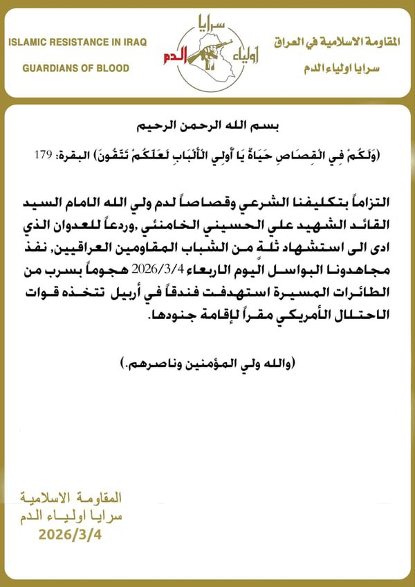 The group stated in its official statement, “Today, Wednesday, March 4 (2026), our brave mujahideen, with a squadron, targeted a hotel drone in Erbil that the American occupation forces use as a headquarters and residence for their soldiers.”