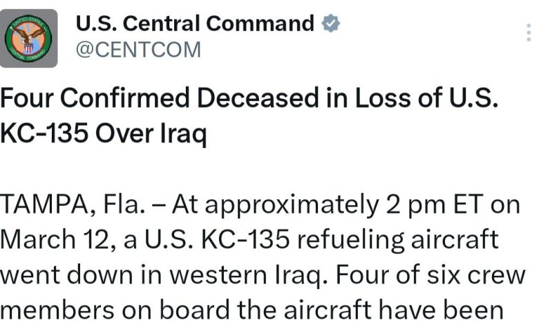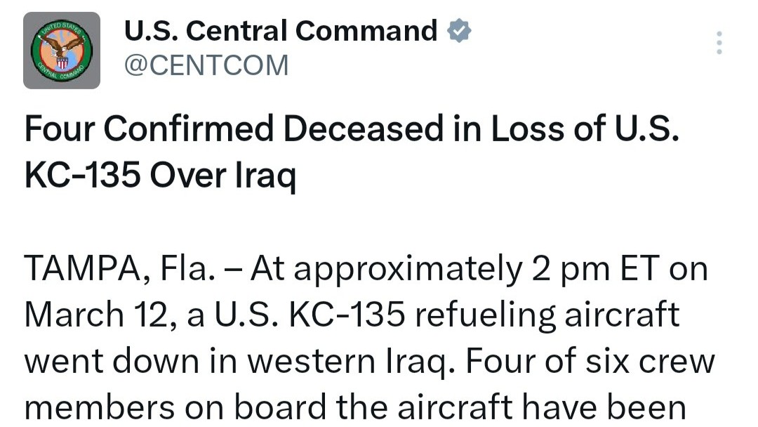 The United States Central Command (CENTCOM) has officially confirmed the deaths of four members of the crew of its KC-135 tanker aircraft that was destroyed last night in the skies over western Iraq.
