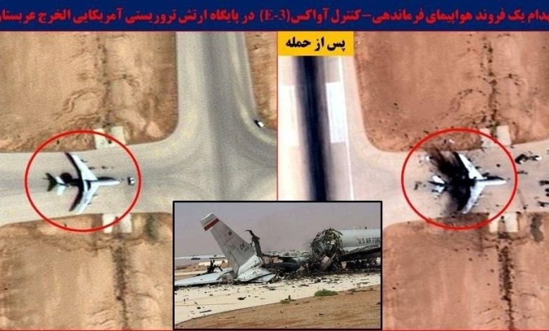 Satellite images have been released showing the destruction of an AWACS (E-3) command and control aircraft at a US military base in the Al-Kharj region of Saudi Arabia.