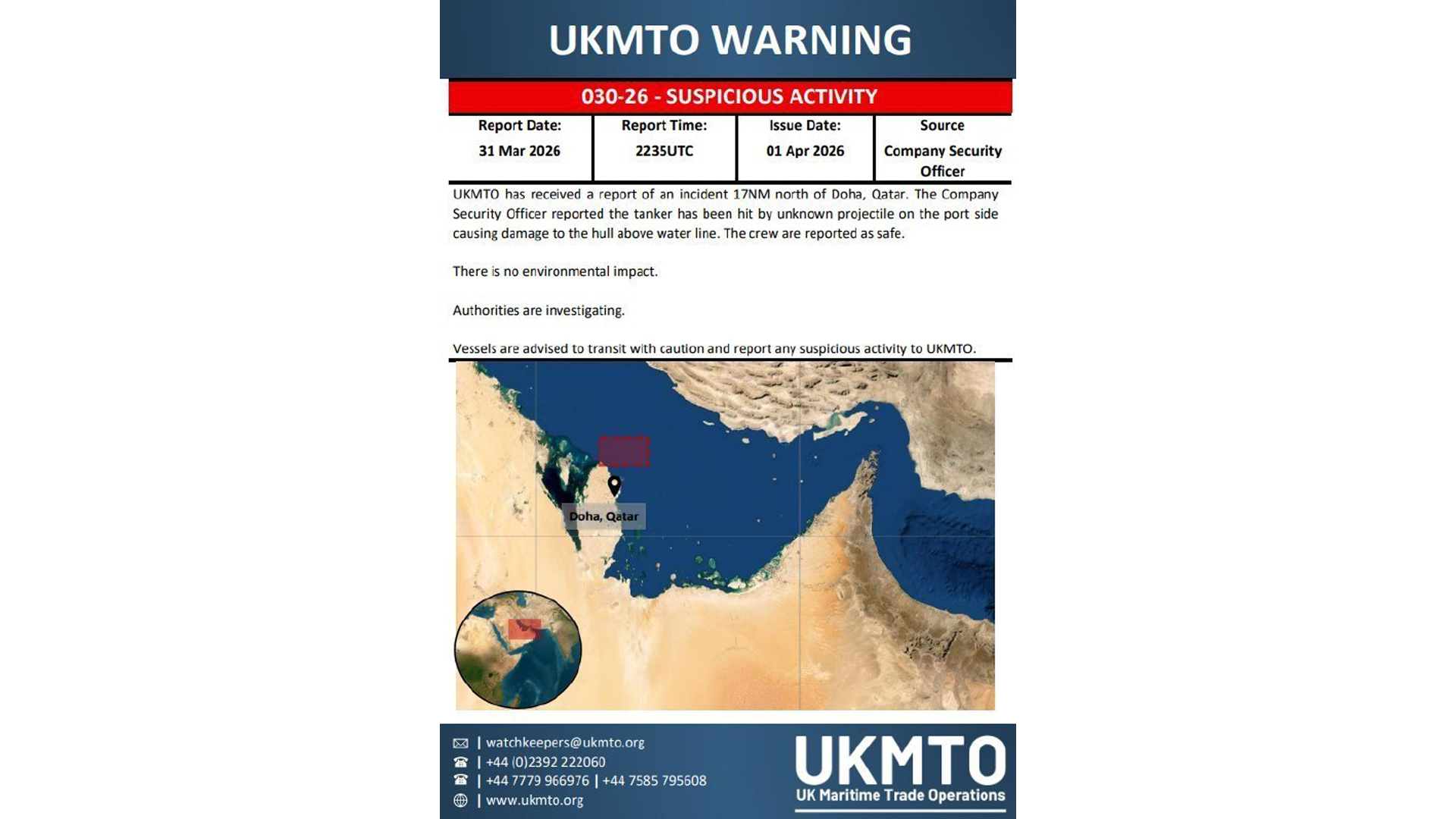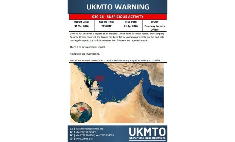 The British maritime watchdog announced that an oil tanker was targeted by an unidentified projectile off the coast of Doha, the capital of Qatar.