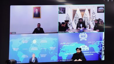 Video call between Molavi Amir Khan Mottaqi and Rashid Muradov, emphasizing the progress of TAPI railway and TAPI projects