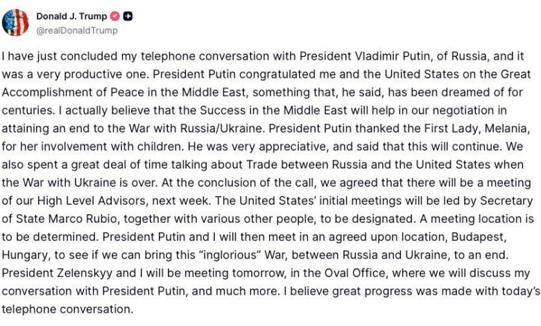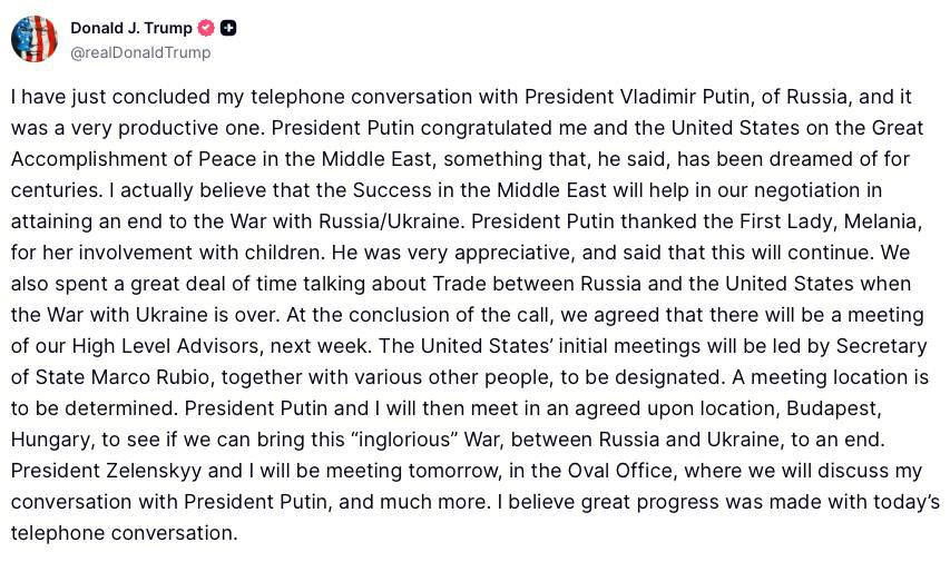 ټرمپ د ټولنیزې شبکې ټروت سوشیل په یوه پوسټ کې لیکلي: “پوتین موږ ته په منځني ختیځ کې د سولې راوستلو کې زموږ د لویې لاسته راوړنې مبارکي وویله، چې له پیړیو راهیسې یې غوښتنه شوې ده؛ زه باور لرم چې په منځني ختیځ کې بریالیتوب به زموږ د روسیې/اوکراین سره د جګړې د پای ته رسولو لپاره د خبرو اترو سره مرسته وکړي.”