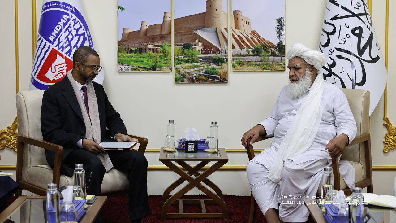 د طبیعي پیښو پر وړاندې د چمتووالي ملي ادارې عمومي رییس ملا نورالدین ترابي پرون سهار (سه شنبه، د ۱۴۰۴ کال د کب ۵ مه) په خپل دفتر کې په افغانستان کې د ملګرو ملتونو د پراختیايي پروګرام (UNDP) له رییس سټیفن روډریګز او د هغه د ملګري پلاوي سره ولیدل.